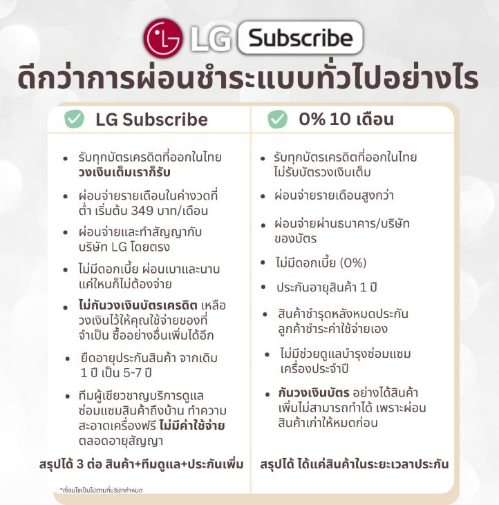 LG Subscribe เป็นบริการให้คุณสามารถเป็นเจ้าของเครื่องใช้ไฟฟ้า LG ได้อย่างง่ายดายแบบรายเดือน พร้อมรับบริการดูแลรักษาจากผู้เชี่ยวชาญจาก LG และประกันสินค้าตลอดอายุสัญญา บริการนี้มีข้อดีหลายประการ ที่การผ่อนชำระแบบ 0% 10 เดือน หรือการซื้อเงินสดให้ไม่ได้ :