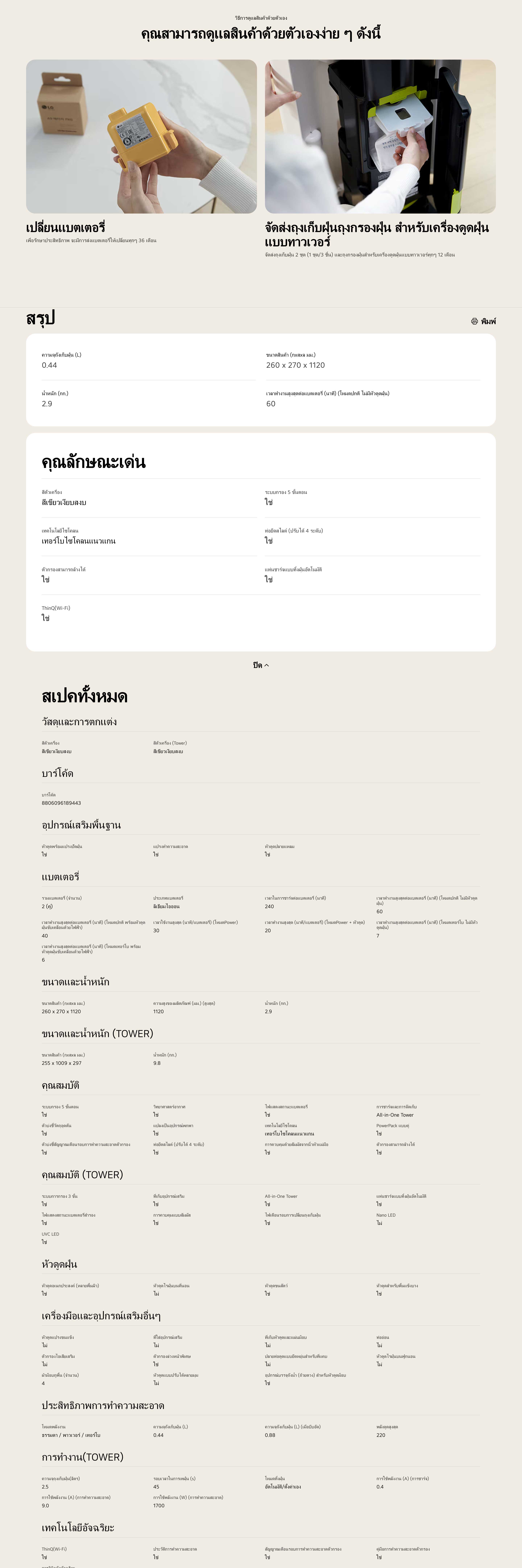 เครื่องดูดฝุ่น LG CordZero™ รุ่น A9T-CORE แบบด้ามจับ All-in-One Tower (ไม่มีหัวถูกพื้น)