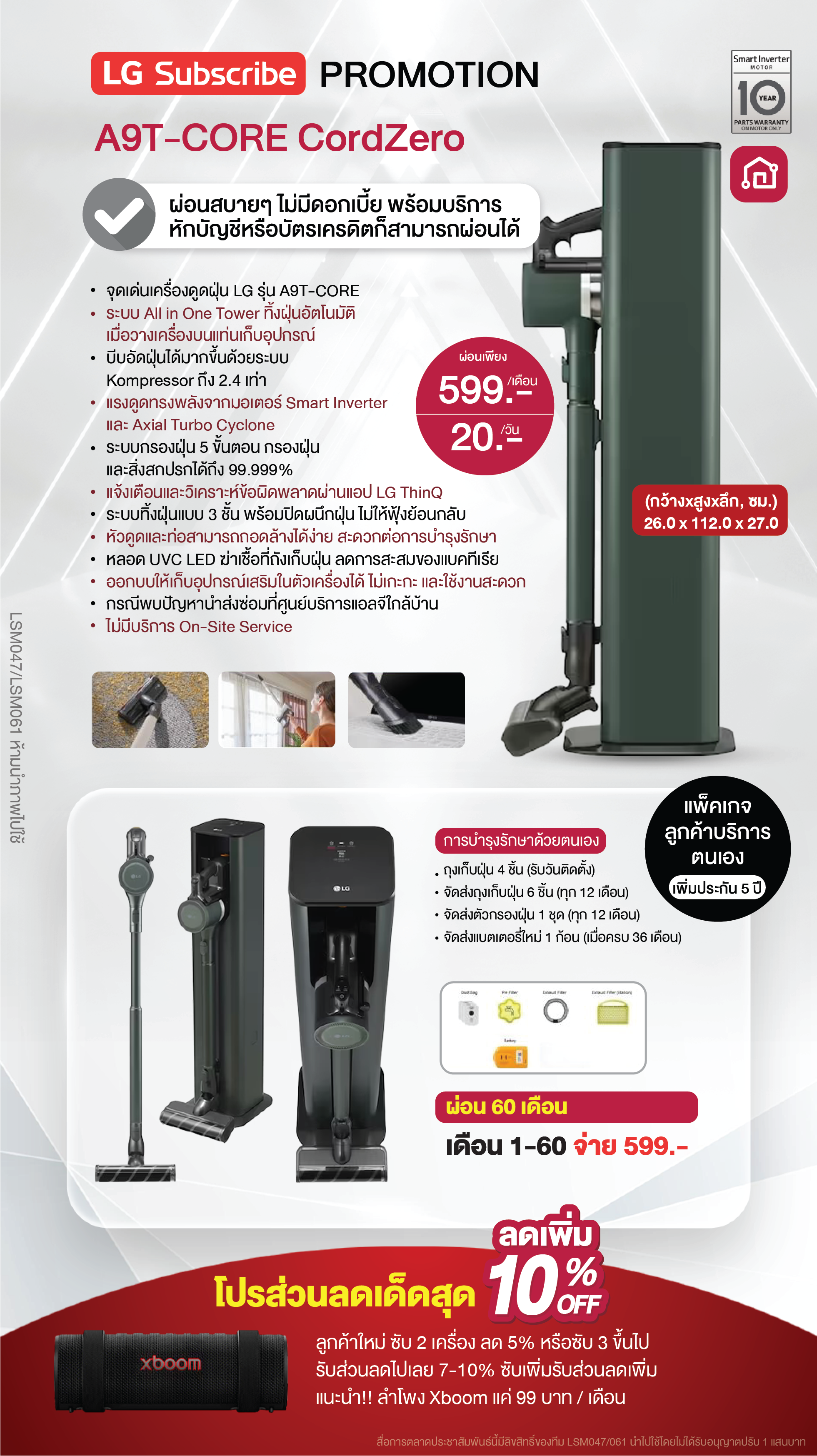 ค่างวดเริ่มต้นเพียง 4xx - 6xx บาทต่อเดือน อัตราดอกเบี้ย 0% นานสูงสุด 60 เดือน รองรับบัตรเครดิตที่วงเงินเหลือน้อยโดยไม่มีการปฏิเสธ ขยายระยะเวลาการรับประกันจาก 1 ปี เป็น 5-7 ปี บริการซ่อมแซมเครื่องโดยไม่มีค่าใช้จ่าย ฟรีค่าแรงและอะไหล่แท้ 100% ไม่มีค่าใช้จ่ายเพิ่มเติมในอนาคต เดือนแรกสามารถใช้งานได้โดยไม่มีค่าใช้จ่าย บริการติดตั้งฟรีโดยช่างจาก LG สิทธิพิเศษเพิ่มเติมอีกเพียบ