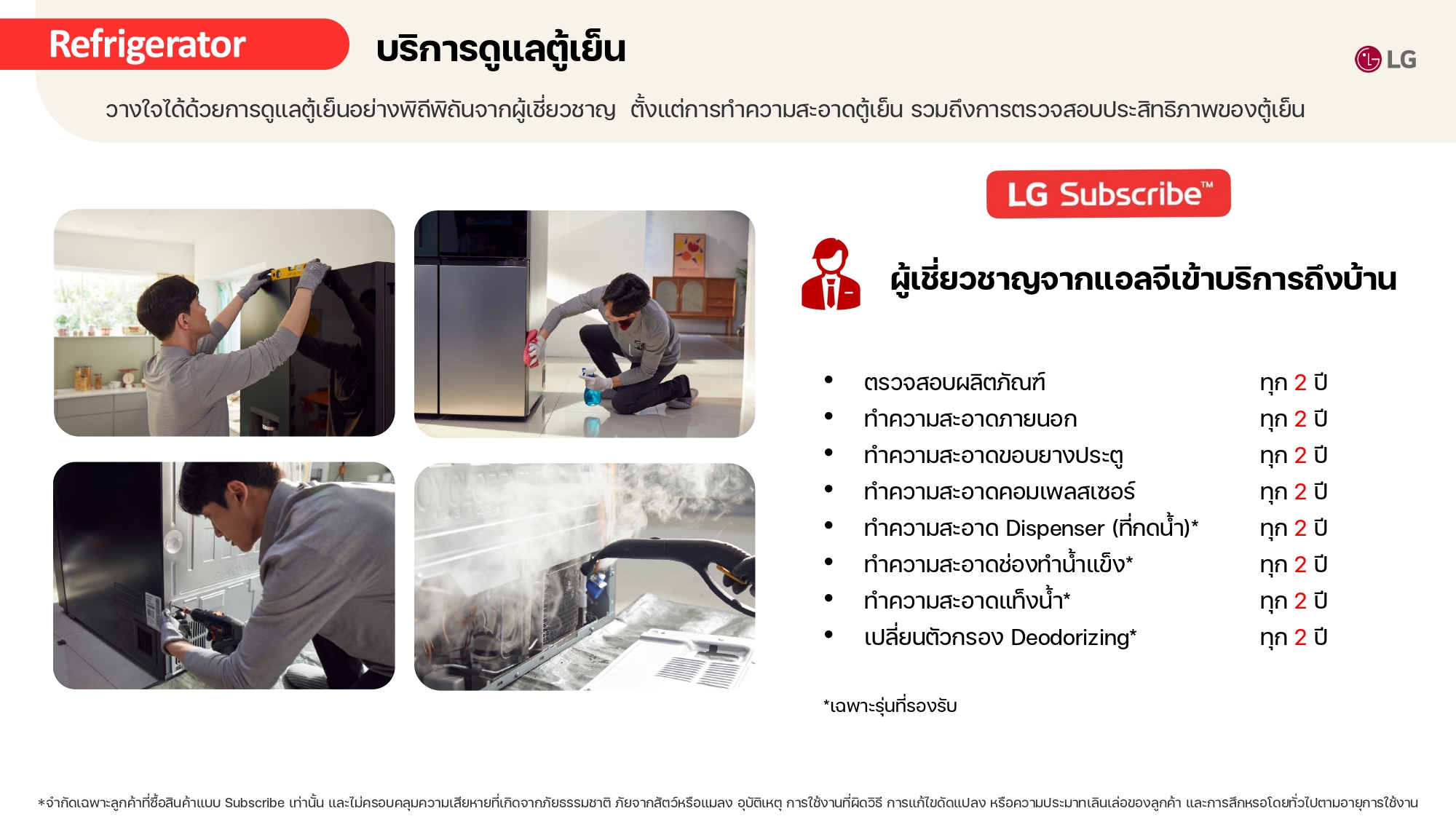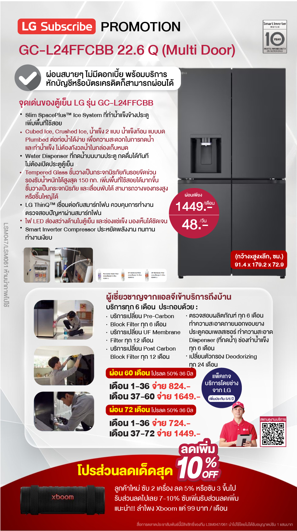 ค่างวดเริ่มต้นเพียง 4xx - 6xx บาทต่อเดือน อัตราดอกเบี้ย 0% นานสูงสุด 60 เดือน รองรับบัตรเครดิตที่วงเงินเหลือน้อยโดยไม่มีการปฏิเสธ ขยายระยะเวลาการรับประกันจาก 1 ปี เป็น 5-7 ปี บริการซ่อมแซมเครื่องโดยไม่มีค่าใช้จ่าย ฟรีค่าแรงและอะไหล่แท้ 100% ไม่มีค่าใช้จ่ายเพิ่มเติมในอนาคต เดือนแรกสามารถใช้งานได้โดยไม่มีค่าใช้จ่าย บริการติดตั้งฟรีโดยช่างจาก LG สิทธิพิเศษเพิ่มเติมอีกเพียบ