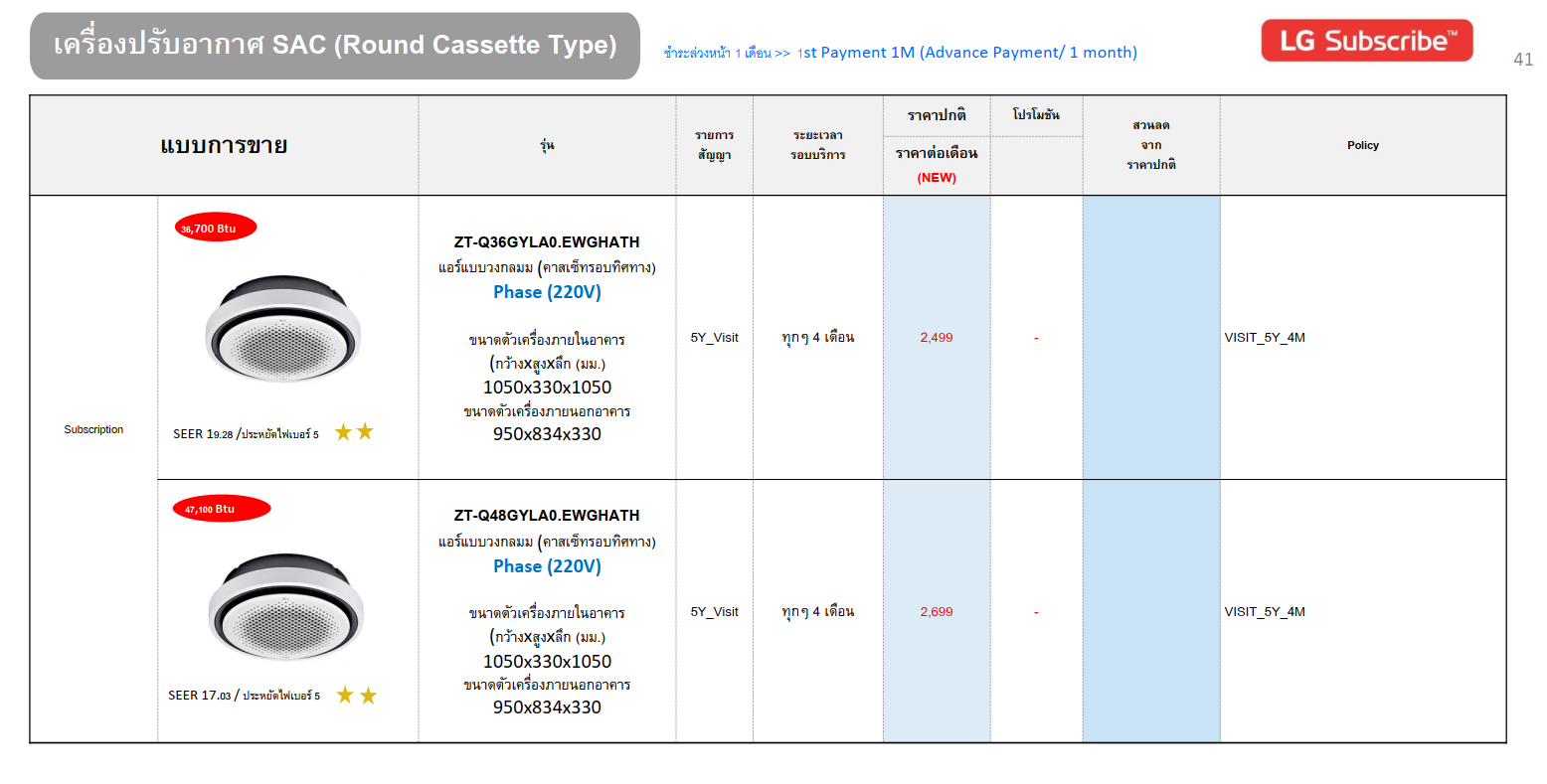 ค่างวดเริ่มต้นเพียง 4xx - 6xx บาทต่อเดือน อัตราดอกเบี้ย 0% นานสูงสุด 72 เดือน รองรับบัตรเครดิตที่วงเงินเหลือน้อยโดยไม่มีการปฏิเสธ ขยายระยะเวลาการรับประกันจาก 1 ปี เป็น 5-7 ปี บริการซ่อมแซมเครื่องโดยไม่มีค่าใช้จ่าย ฟรีค่าแรงและอะไหล่แท้ 100% ไม่มีค่าใช้จ่ายเพิ่มเติมในอนาคต เดือนแรกสามารถใช้งานได้โดยไม่มีค่าใช้จ่าย บริการติดตั้งฟรีโดยช่างจาก LG สิทธิพิเศษเพิ่มเติมอีกเพียบ
